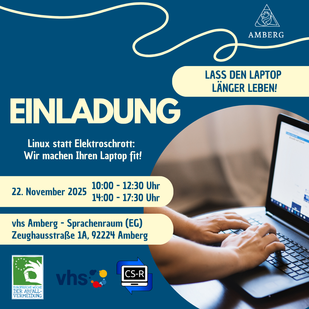 Die Abfallberatung der Stadt Amberg und die Volkshochschule Amberg laden gemeinsam mit dem Verein Computerspende Regensburg e. V. zu der Aktion „Lass den Laptop länger leben – Linux statt Elektroschrott“ ein!