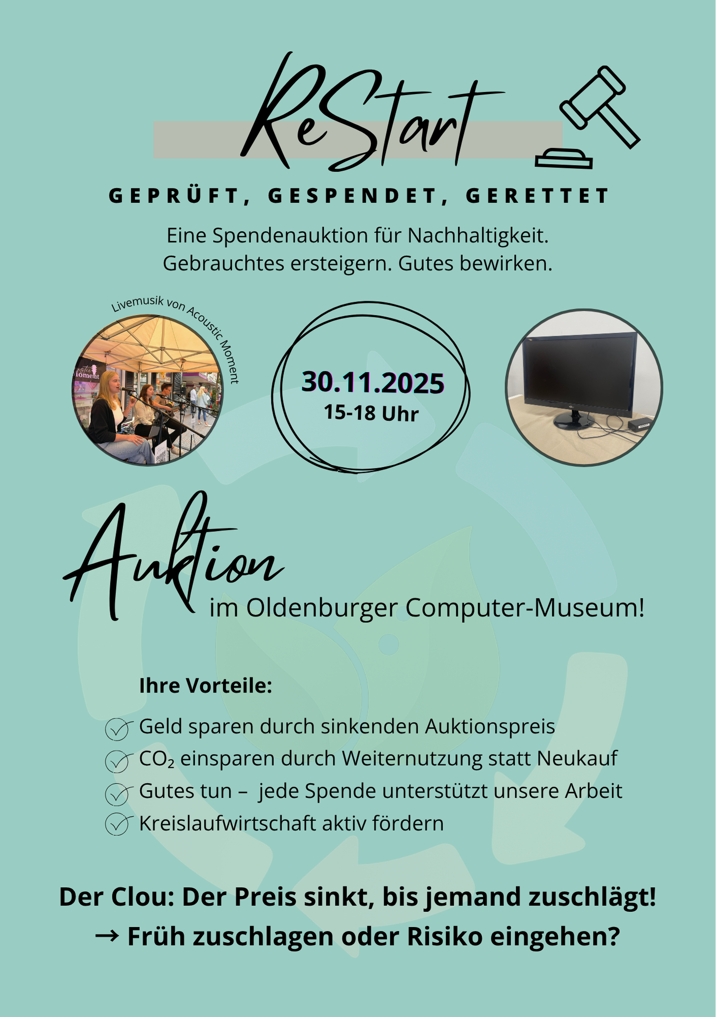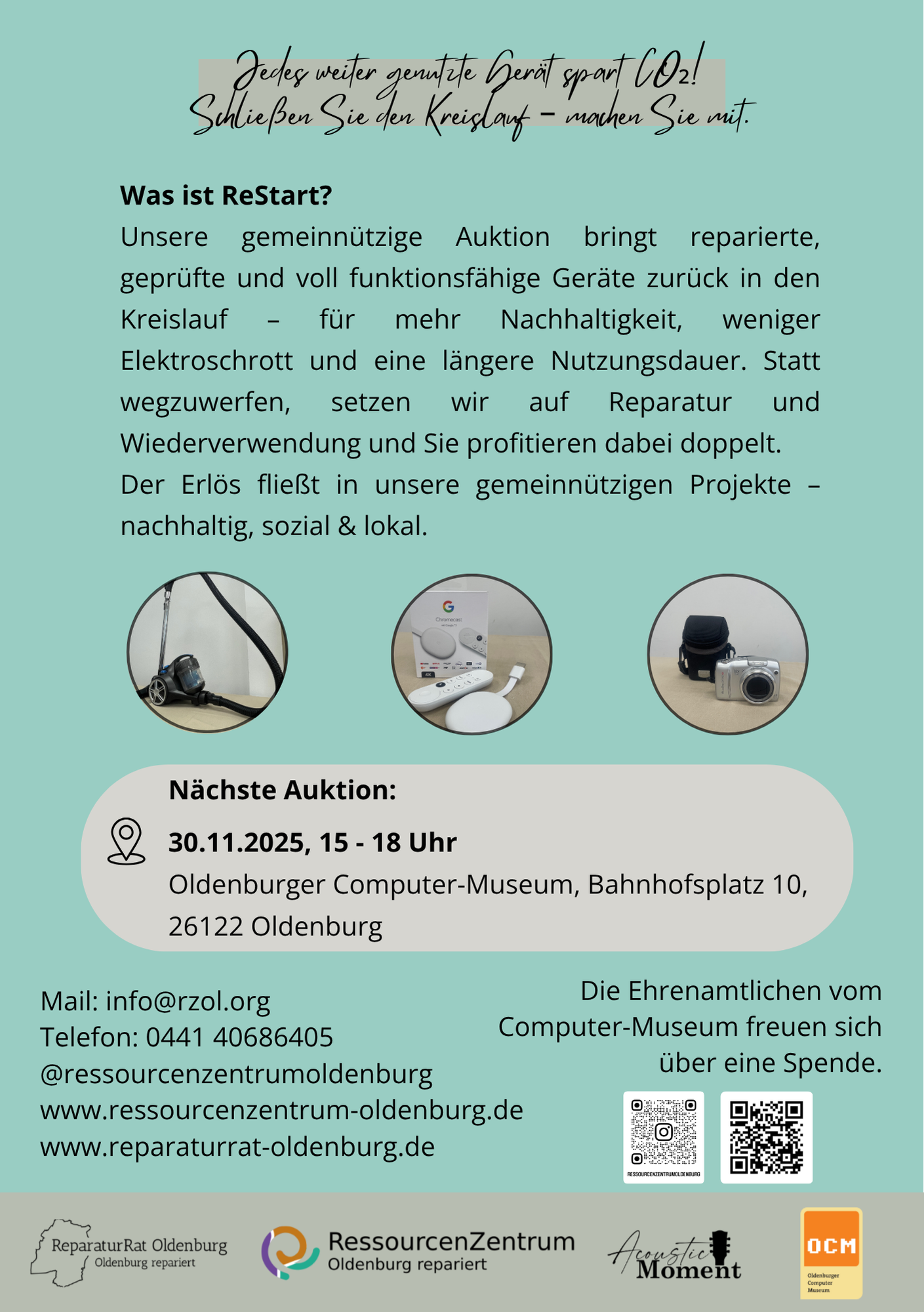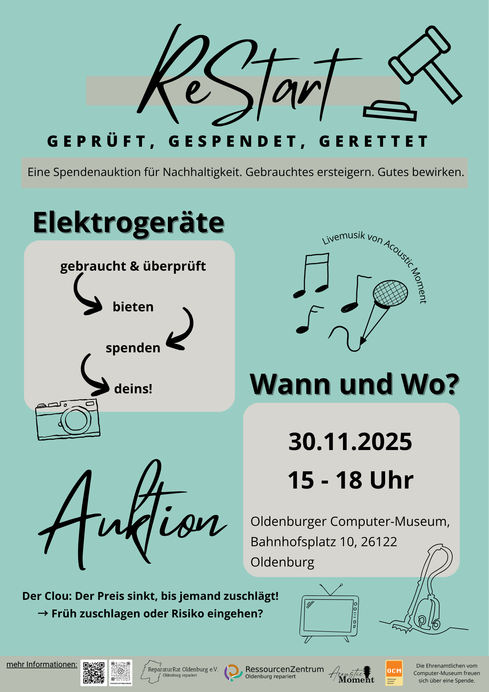 Die erste Versteigerung findet nun am 30.11.2025 von 15:00 Uhr bis 18:00 Uhr im Oldenburger Computer-Museum (OCM, Bahnhofsplatz 10, 26122 Oldenburg) statt. Wer vorher wissen will, welche Gegenstände angeboten werden, kann sich unter https://web.reparaturrat-oldenburg.de/ umschauen. Und wer nichts ersteigern, sondern sich einfach nur amüsieren, das Computer-Museum erkunden oder mit den Aktiven des ReparaturRates plaudern will, ist genauso herzlich willkommen. Übrigens, am 30.11. wird es auch Live Musik vom Trio Acoustic Moment, Getränke und weihnachtliche Leckereien geben. Diese Veranstaltung soll nach Möglichkeit in regelmäßigen Abständen wiederholt werden.